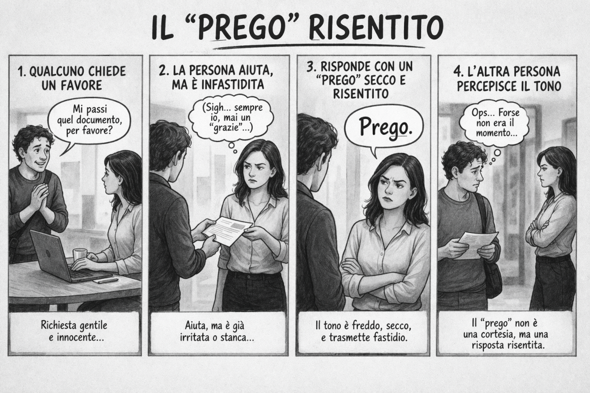 Perché prego sulla carta è una parola gentile. Nella realtà, invece, è una parola che cambia faccia con una velocità impressionante. Può essere accoglienza, risposta, permesso, disponibilità, fastidio, superiorità morale, irritazione compressa, e in certi casi persino minaccia con i guanti.