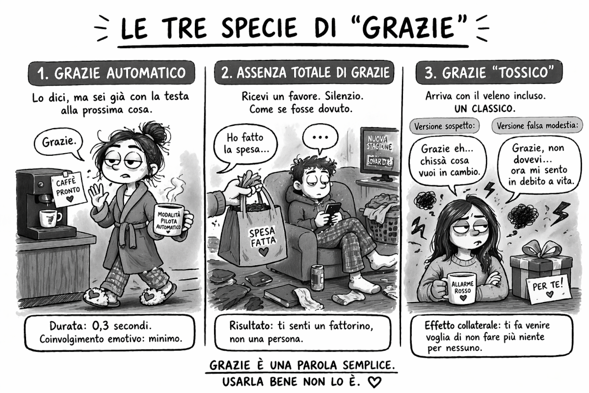 C'è il grazie automatico. Detto per riflesso. Non sentito, non abitato, non vissuto. Emesso. Un ringraziamento in tetrapak.